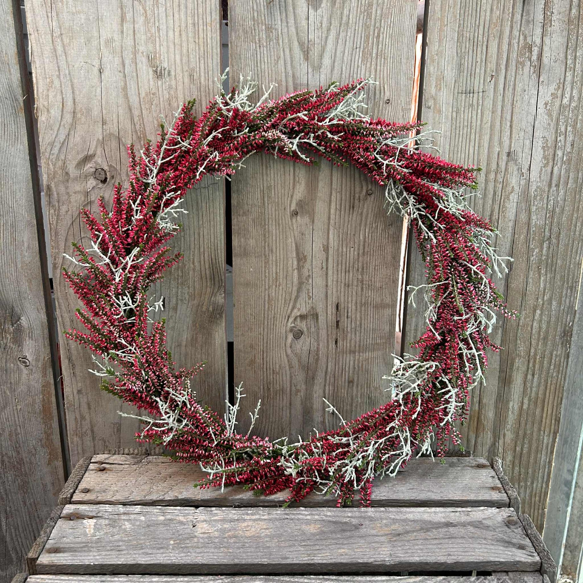 En stilren dörrkrans där ljung och silvergirland har lindats på en tunn metalstomme. Storlek på dörrkrans ø 35cm. Skriv gärna önskemål om vit eller cerise ljung.
