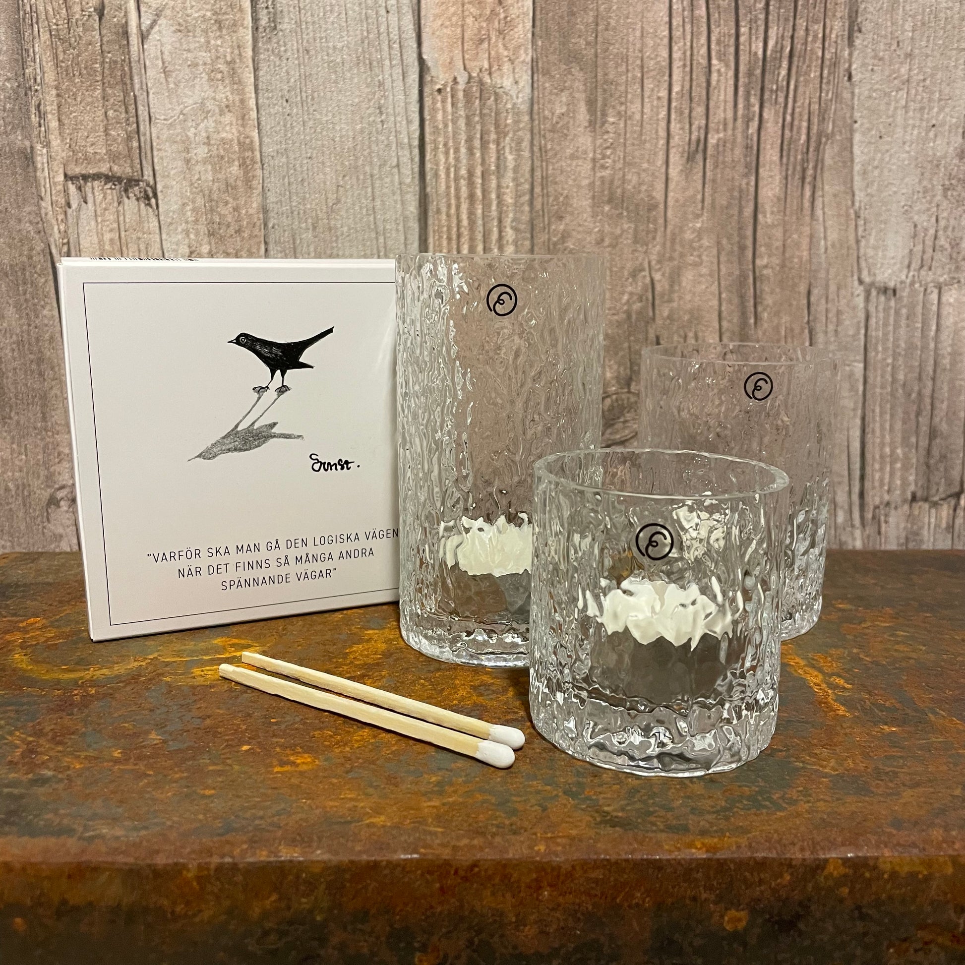 Tre stycken fina ljuslyktor från ERNST tillsammans med tändsticksask även det från ERNST. Storlek ljuslyktor höjd 6,5 cm ø 6 cm, höjd 8,5 cm ø 6 cm, höjd 11,5 cm ø 6 cm. Tändsticksask 11*11 cm.