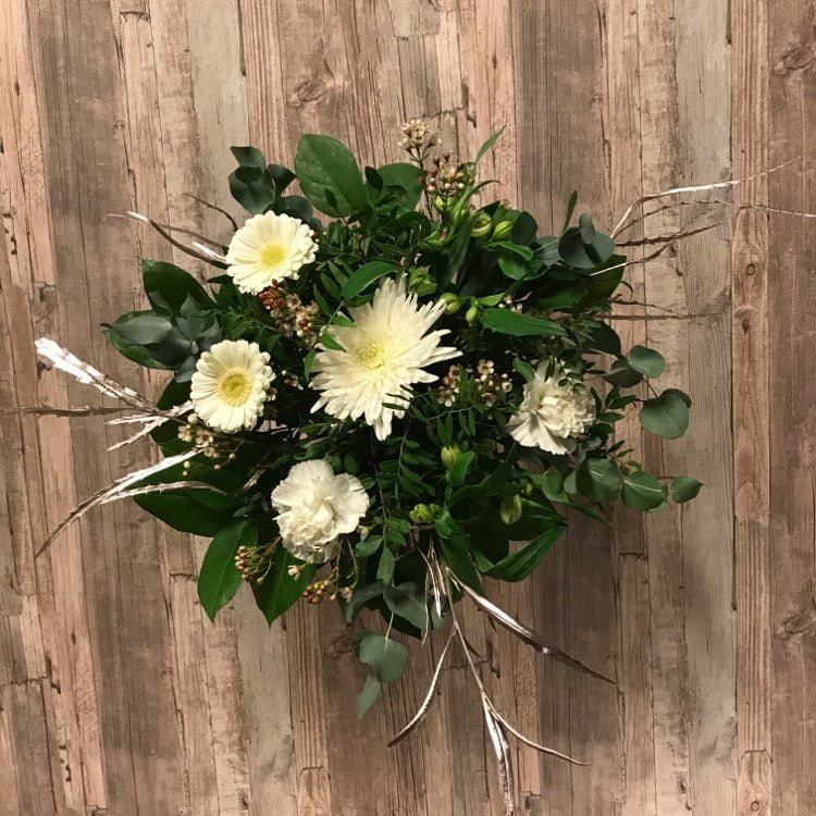 Floristen skapar en julig bukett i vita toner. Blommor kan variera men buketten blir i vita toner.